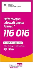 Frauen“. Unter der Nummer 08000 116 016 bekommen Betroffene und ihr Umfeld in 17 Sprachen Unterstützung und Informationen, zum Beispiel über Beratungsstellen in ihrer Nähe.