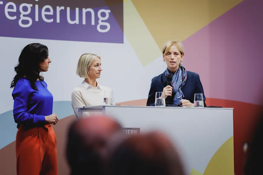 Diskussion über digitalen Jugendschutz: Beim Bürgerfest zum Tag der Deutschen Einheit diskutiert Bundesbildungsministerin Karin Prien mit Nadine Schön über die Arbeit der Expertenkommission "Kinder- und Jugendschutz in der digitalen Welt"