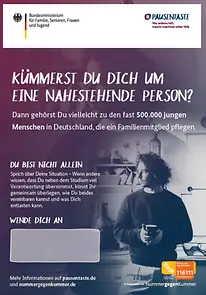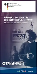 Auf dem Webportal "Pausentaste" finden junge Pflegende, Fachkräfte und Interessierte Erfahrungsberichte, Interviews und Medientipps. Darüber hinaus weist das Webportal auf Beratungsstellen, Hilfsangebote, Gesprächsgruppen und Workshop-Angebote von Initiativen vor Ort hin. Zudem gibt es Tipps für Eltern und Fachkräfte sowie verschiedene Materialien zum Downloaden (Flyer, Plakate, Infokarten). Zur Entlastung von pflegenden Kindern und Jugendlichen wurde im Jahr 2024 ein onlinebasierter, niedrigschwelliger Selbsteinschätzungstest auf der Website integriert.